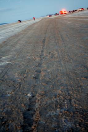 in motion, squirming our way down the wet salt. Mike read off the speeds to me,